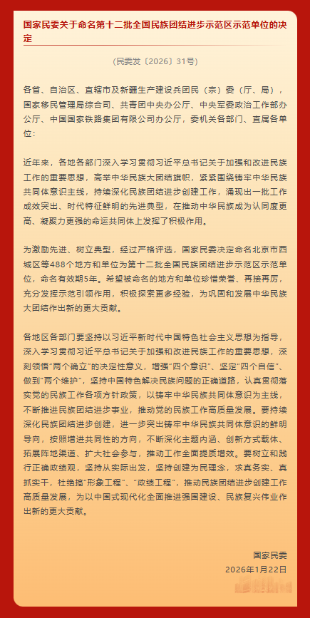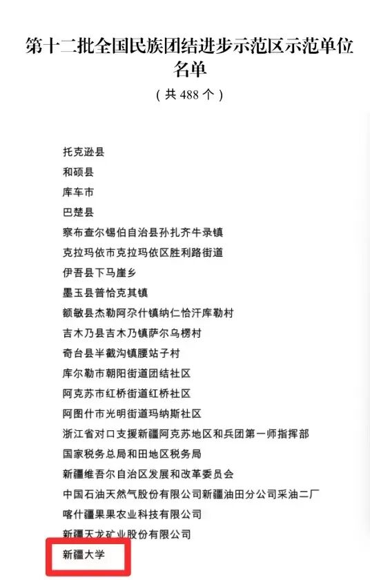 1月29日,国家民委公布第十二批全国民族团结进步示范区示范单位名单,新疆大学被国家民委命名为 “第十二批全国民族团结进步示范单位”。(以下为部分名单)